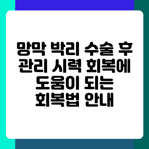 망막 박리 수술을 받으셨나요? 수술 후 시력 회복은 정말 중요한데, 어떻게 관리해야 할지 막막하시죠? 수술 후 회복 과정은 생각보다 까다로워서, 조금만 방심해도 시력 회복에 차질이 생길 수 있답니다. 저는 수많은 환자분들의 회복 과정을 지켜보며 얻은 노하우와 전문가들의 조언을 바탕으로, 여러분의 시력 회복을 돕는 효과적인 회복 가이드를 준비했습니다. 함께 자세히 알아보고, 건강한 눈으로 다시 세상을 바라보도록 해요.