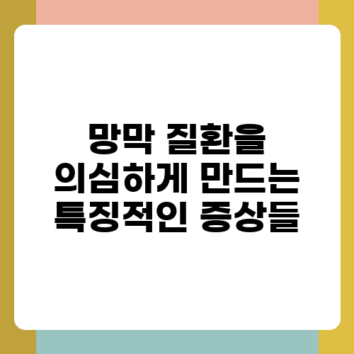 망막 이상 증상은 매우 다양하고 미묘하게 나타날 수 있기 때문에, 초기에 증상을 인지하기 어려운 경우가 많습니다. 하지만, 일부 증상들은 망막 질환을 의심할 수 있는 특징적인 징후를 보입니다. 예를 들어, 빛 번짐이나 섬광 현상은 망막의 찢어짐이나 박리와 같은 심각한 문제를 시사할 수 있습니다. 또한, 눈앞에 떠다니는 벌레나 실 같은 물체 (비문증) 역시 망막 질환의 가능성을 높이는 중요한 지표입니다. 이러한 증상들은 망막 출혈이나 망막 퇴행으로 인해 발생하며, 방치할 경우 시력 저하나 실명으로 이어질 수 있으므로 각별한 주의가 필요합니다. 특히 갑작스러운 증상 발생은 심각한 망막 질환의 전조일 수 있으므로 절대 가볍게 여겨서는 안됩니다. 만약 이러한 증상을 경험한다면 즉시 안과 전문의를 찾아 정확한 진단과 치료를 받는 것이 가장 중요합니다. 빠른 조치가 시력을 보존하고 실명을 예방하는 데 결정적인 역할을 할 수 있다는 점을 기억하세요.