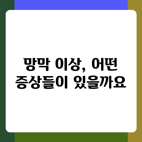 망막 이상은 다양한 증상으로 나타납니다. 가장 흔한 증상은 시력 저하입니다. 갑자기 시력이 흐릿해지거나, 사물이 겹쳐 보이거나, 일부 영역이 보이지 않는 등의 증상이 나타날 수 있습니다. 또한, 눈앞에 갑자기 밝은 섬광이 번쩍이거나, 검은 점이나 실 같은 것이 떠다니는 것처럼 보이는 증상도 있습니다. 이러한 증상들은 망막에 출혈이나 퇴행성 변화가 생겼을 때 나타날 수 있는데, 특히 중심부 시력에 문제가 생기면 일상생활에 큰 불편함을 겪게 될 수 있어요. 단순히 눈의 피로라고 생각하고 방치하면 실명으로 이어질 수 있으므로, 이러한 증상이 나타난다면 즉시 안과 전문의의 진료를 받는 것이 중요합니다. 저도 몇 년 전, 눈앞에 갑자기 검은 점들이 떠다니는 현상을 경험하고 깜짝 놀라 병원을 찾았던 기억이 나네요. 다행히 큰 문제는 아니었지만, 그때 초기에 진료받지 않았다면 어떻게 되었을까 생각하면 아찔합니다. 망막 질환은 조기 진단과 치료가 중요하다는 사실을 다시 한번 깨달았습니다.
