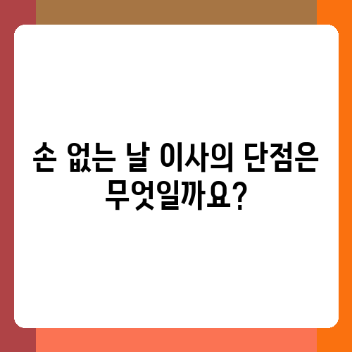 손 없는 날 이사는 비용이 비싸다는 점 외에도 몇 가지 단점이 있습니다. 가장 큰 단점은 바로 '경쟁이 치열하다'는 점입니다. 많은 사람들이 손 없는 날에 이사를 하려고 하기 때문에, 원하는 이사 업체를 예약하기 어렵거나, 원하는 시간대에 이사를 할 수 없을 수도 있어요. 미리 예약하지 않으면 원하는 시간에 이사를 못 할 수도 있다는 점, 꼭 기억하세요. 또한, 이사 과정에서 예약 변경이나 취소가 발생할 가능성이 높아지는 것도 감안해야 합니다. 계획대로 진행되지 않아 스트레스를 받을 수도 있다는 점을 고려해야 합니다.